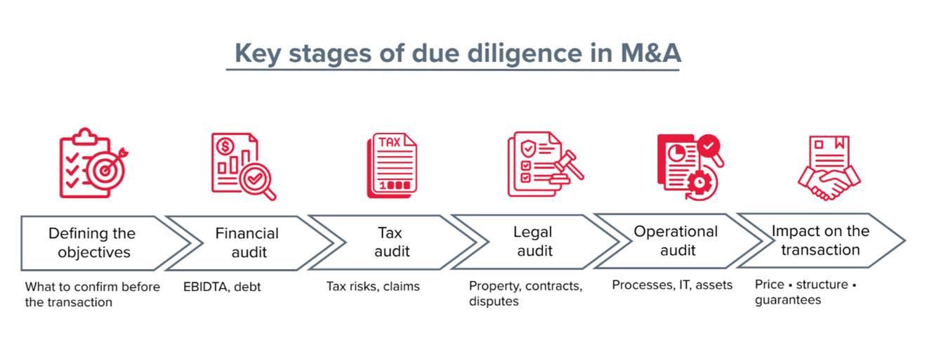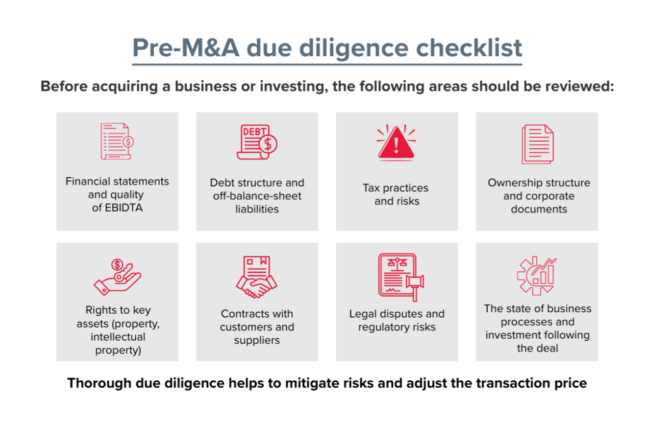 In a broad sense, due diligence is the process of collecting and analysing information about a business entity prior to entering into a transaction or acquiring assets. In the context of M&A, it is a comprehensive review of the target company or investment object, focusing on factors that may affect the feasibility of closing the deal, the purchase price and payment mechanism, the transaction structure, as well as the scope of warranties and the liability of the parties. Fortunately, most potential issues can be identified at an early stage of the review (except in cases of deliberate fraud). Therefore, high-quality due diligence provides a high level of assurance that the actual condition of the target will largely correspond to the terms underlying the transaction.