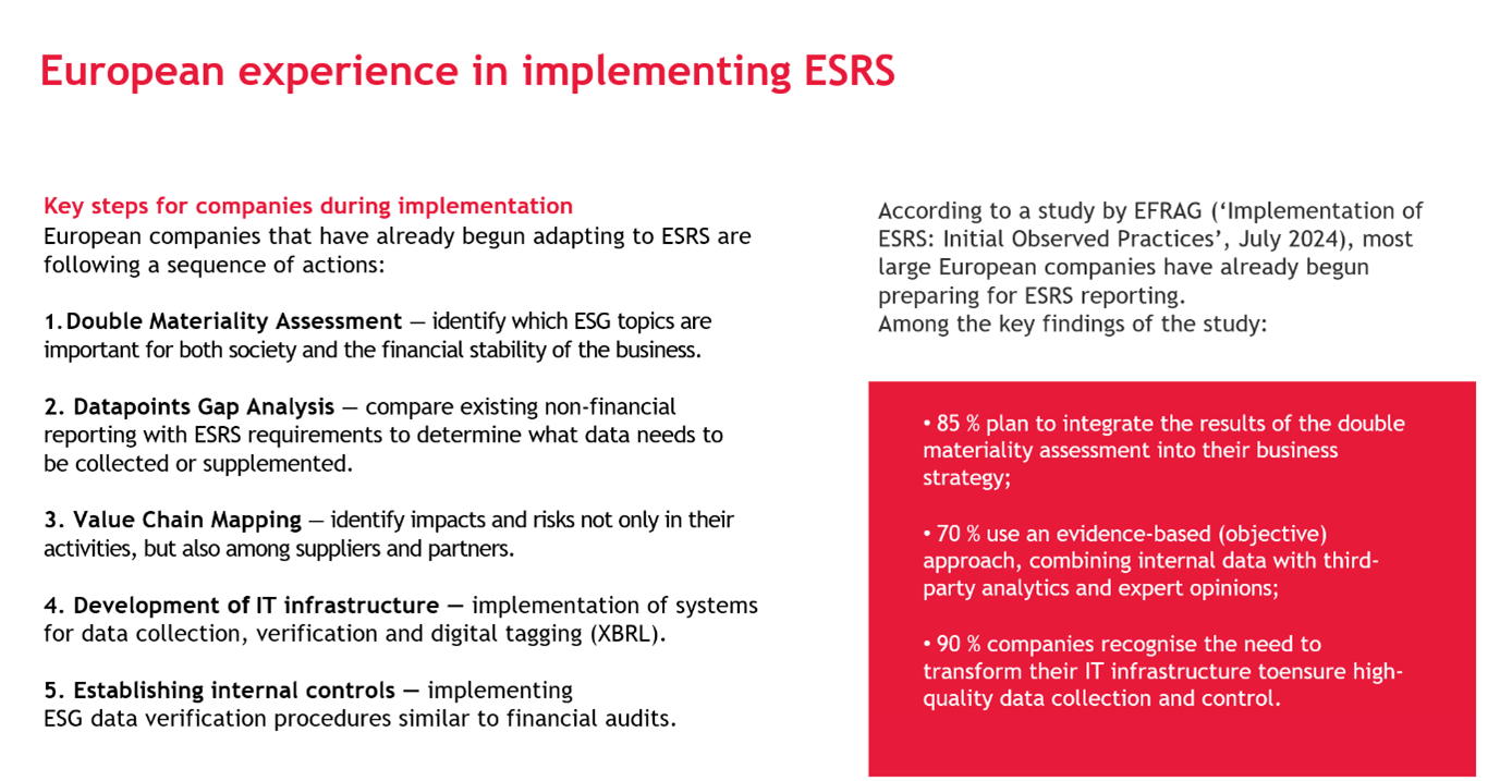 It was noted by webinar participants that there has been a significant increase in interest in non-financial reporting in recent years. This has been driven by European integration processes and increased requirements from international partners. In accordance with the new EU directives, particularly the Omnibus package, the deadlines for mandatory reporting for many companies have been postponed, providing additional time for the high-quality preparation and implementation of the necessary changes in internal processes.