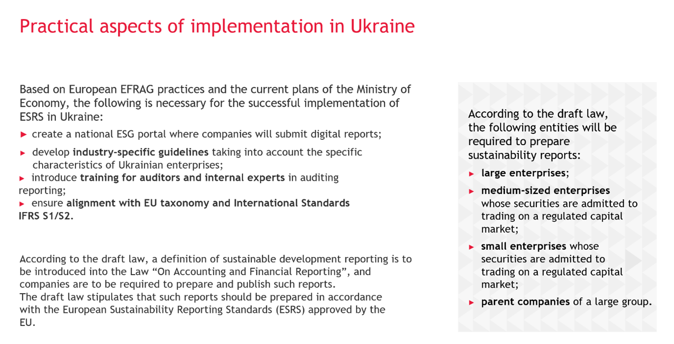 ESRS standards establish a clear framework for reporting on sustainable development. Ukrainian companies working with EU partners are already required to comply with these standards, even though the relevant legislative requirements are still in the process of harmonisation.