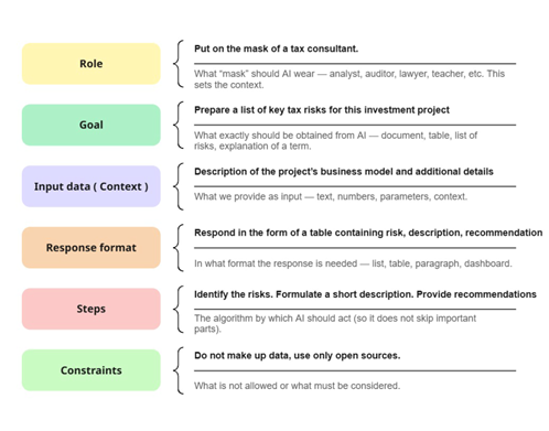 Industry groups at BDO in Ukraine have developed their own prompts, taking into account its specifics. A detailed analysis was conducted of the types of documents, requests and analyses that our consultants and auditors most often prepare. This analysis resulted in the creation of a structure for them in the form of steps, questions and response formats. Please find below a few examples of such prompts and how we use them in practice: