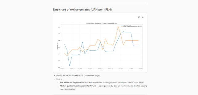 • For the economic unit, a prompt was created “Currency Rate Monitoring”. This generates graphs and CSV data for the last 30 days, thereby helping analysts to track trends and communicate them in a convenient format. An example of a response from Copilot to a task involving the collection of PNL/UAH data. We also received CSV and high-level analytics from it.