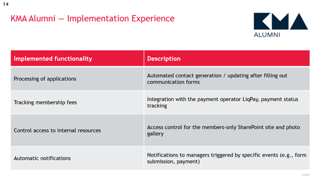 Andrii shared his experience of automating processes at KMA Alumni. The main problem was the manual administration of contributions, which made monitoring difficult and resulted in missed payments. The solution was to implement an application processing system and integrate LiqPay to track payments, control access through SharePoint and provide automatic notifications.