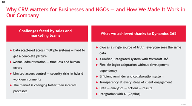 In this context, a CRM system is an indispensable tool. It enables the automation of key stages of work, from application receipt and approval to recipient support, documentation maintenance and donor communication. A reliable CRM platform, such as Microsoft Dynamics 365, provides the transparency, control and flexibility that modern NGOs need to operate effectively.
