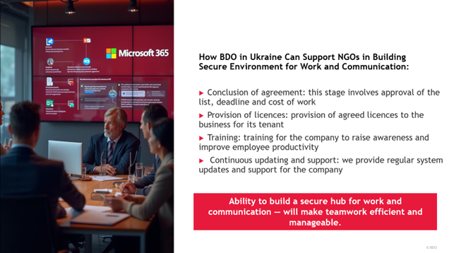Andrii Paios, Head of IT, concluded the meeting with a speech. He emphasised that BDO in Ukraine is a Microsoft Gold Partner with deep expertise in implementing solutions for non-profit organisations. He noted that it is important to combine all Microsoft services into a single ecosystem to make organisation management as convenient as possible. He also mentioned that Microsoft provides free licences for non-profit organisations, and recommended contacting BDO in Ukraine for more information and assistance with implementing Microsoft solutions.