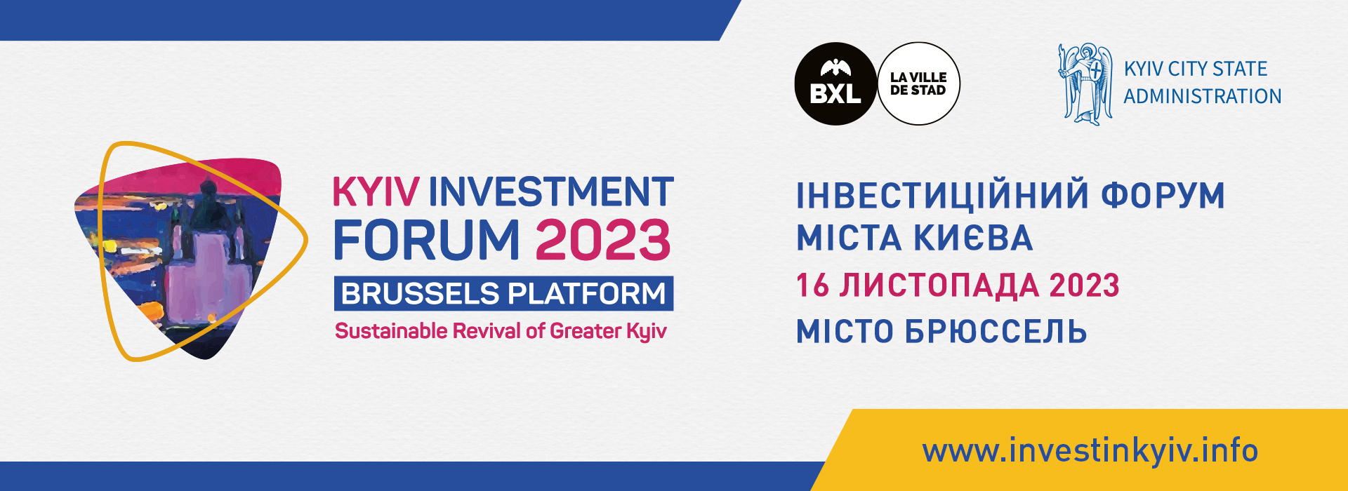 Це бачення узагальнить Інвестиційний форум міста Києва, який відбудеться 16 листопада 2023 року в бельгійський столиці під гаслом «Брюссельська платформа: стале відродження київської агломерації». Керманичами форуму стануть мер Брюсселя Філіп Клоз та мер Києва Віталій Кличко. Форум об’єднає лідерів міст, європейських та українських політиків, провідних економістів, інвесторів та урбаністів.
