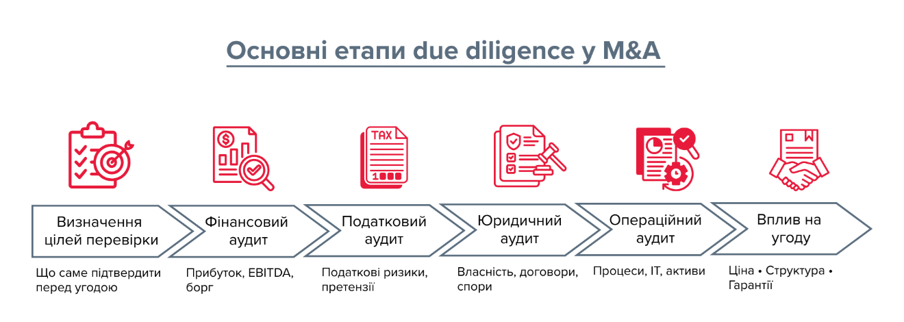 - Узгодження базових принципів та принципових умов угоди до старту повного due diligence (щоб не витратити ресурси на перевірку «заради перевірки»).