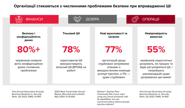 - За даними опитування, 77% організацій стурбовані ризиком prompt injection, ще 11% — «дуже стурбовані».