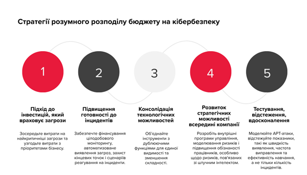 - Ризик-орієнтовані інвестиції (threat-led approach): спрямовуйте бюджет на найбільш критичні загрози та узгоджуйте витрати з бізнес-пріоритетами.