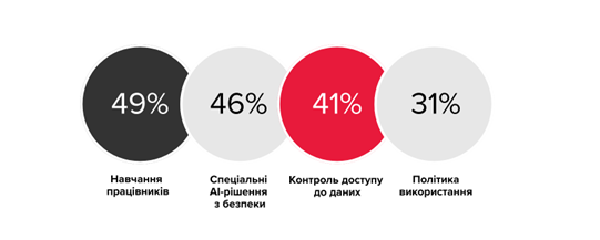 Найпоширеніші практики, які організації застосовують для мінімізації ризиків, пов’язаних із використанням штучного інтелекту є навчання співробітників (49%), далі — впровадження спеціалізованих AI-рішень для безпеки (46%) і посилення контролів доступу до даних (41%). Водночас лише 31% організацій мають формалізовані політики використання, що вказує на потребу швидше закривати прогалини в управлінні та правилах застосування AI.