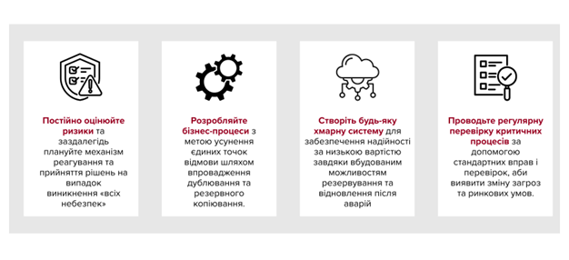 - Проектуйте бізнес-процеси таким чином, щоб усунути єдині точки відмови, запровадивши дублювання та резервне копіювання.