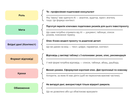Галузеві групи в BDO в Україні підготували власні промпти, що враховують її специфіку. Ми проаналізували, які типові документи, запити чи аналізи найчастіше готують наші консультанти й аудитори, і виписали для них структуру у вигляді кроків, питань та формату відповіді. Нижче наведено кілька прикладів таких промптів та як ми їх використовуємо на практиці: