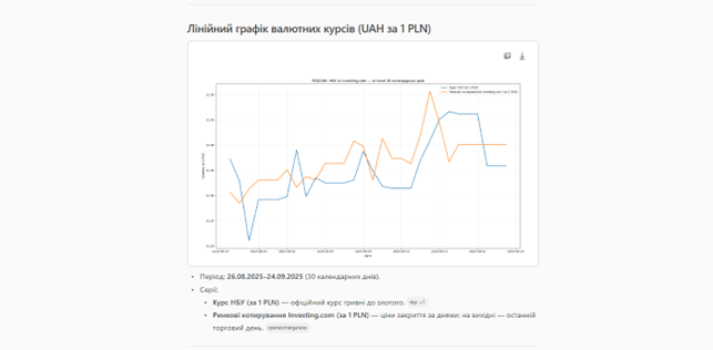 - Для економічного блоку створено промпт “Моніторинг валютних курсів”, що генерує графіки та CSV-дані за останні 30 днів, допомагаючи аналітикам відслідковувати тренди й комунікувати ними в зручному форматі. Приклад відповіді від Copilot по завданню збору даним PNL/UAH. Також отримали від нього CSV та верхньорівневу аналітику.