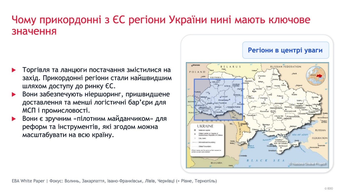 Практичні рекомендації щодо підтримки бізнесу та розвитку прикордонних регіонів також викладені у Білій книзі від EBA, що були розроблені у співпраці з BDO в Україні «Підтримка бізнесу в регіонах України, які мають кордони з ЄС», яка узагальнює ключові виклики, інструменти державної та міжнародної підтримки, а також можливості для підприємців у контексті відбудови України та інтеграції з ЄС.