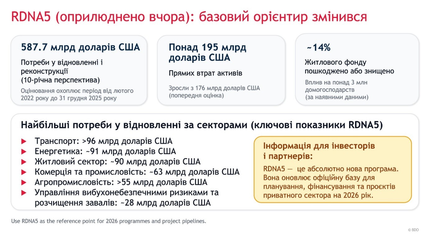 Презентація також торкнулася нового огляду оцінки потреб у відновленні та реконструкції України (RDNA5), в якому відображено найбільші потреби в секторах, як-от транспорт, енергетика, житловий сектор та агропромисловість. Віра підкреслила, що на основі цих даних уряд України та бізнес повинні визначити пріоритети для фінансування відновлення на найближчі роки.