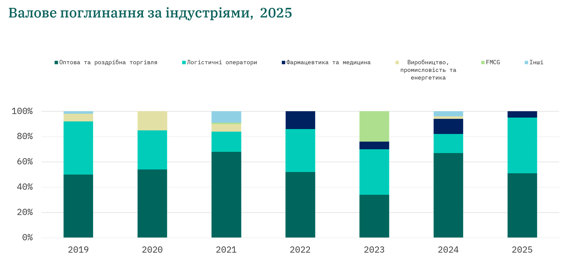 E-commerce сегмент залишався основним драйвером попиту в секторі, оскільки постійні зміни у споживчій поведінці та адаптація бізнесу до умов війни посилили залежність від онлайн-продажів і дистрибуційних мереж. Сектор фармацевтики та медицини демонстрував стабільне зростання, підтримане розширенням діяльності дистриб’юторів і аптечних мереж. Упродовж 2022–2025 років цей сектор забезпечував 10%–15% щорічного валового обсягу поглинання. Водночас, пропозиція готових до використання фармацевтичних складів залишається обмеженою, що спонукає орендарів адаптувати сухі склади відповідно до нормативних та технічних вимог.