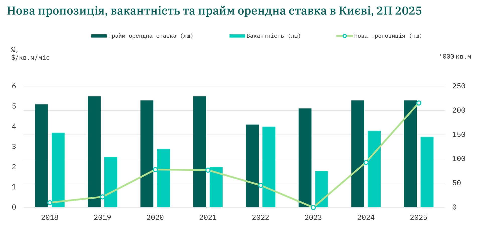 Прайм ефективна орендна ставка залишалася стабільною на рівні $5,3/кв.м/міс (без ПДВ та OPEX), що відповідає довоєнному піковому періоду 2019–2021 років. Більшість орендних угод продовжували укладалися в національній валюті, що відображає поточні макроекономічні умови та волатильність валютного курсу. Запитувані орендні ставки у гривневому еквіваленті для сухих складів продемонстрували середнє зростання на 9% з поч. року, коливаючись в діапазоні 200–250 грн/кв.м/міс ($4,8–$5,5).